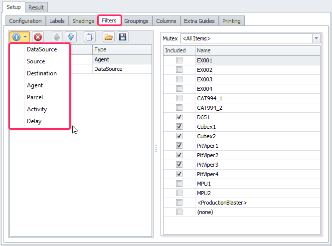 In the Filters tab, you can add filters to your Gantt. There are different types of filters: DataSource, Source, Destination, Agent, Parcel, Activity and Delay.