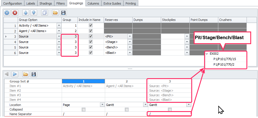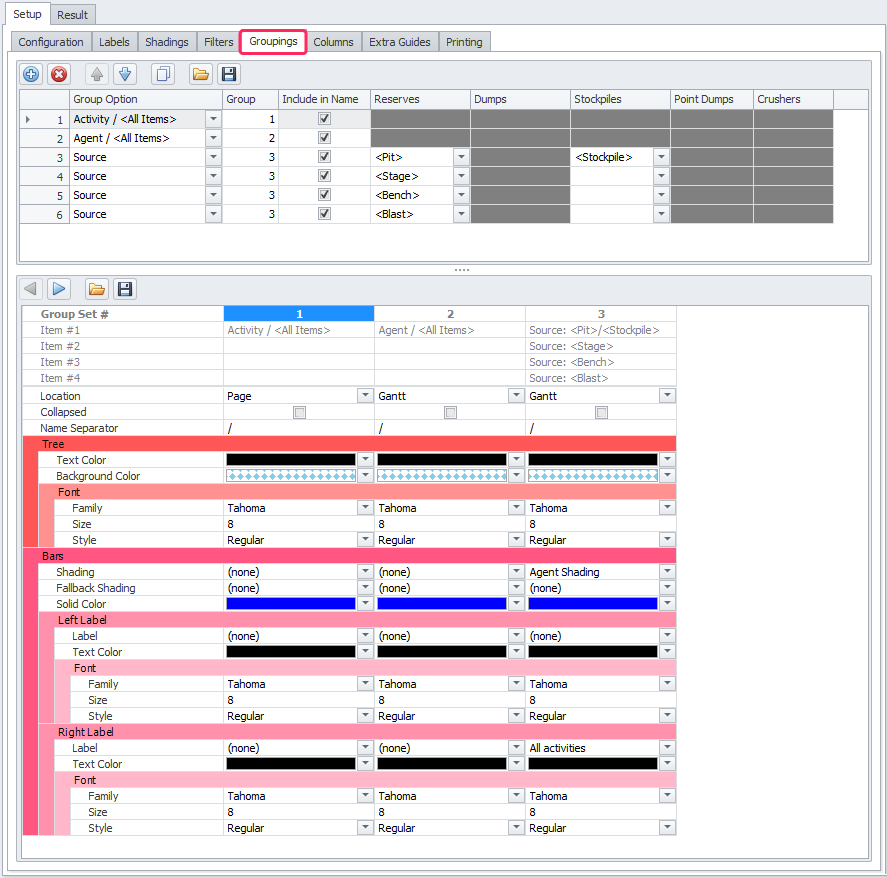 The Groupings tab is a main section to configure how things are displayed on the Gantt. This is really the heart of Gantt report.