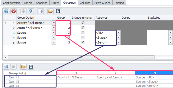 Levels are showing Result tab items from left to right as set in the Grouplings tab. In this example, Level 1 is Activity, Level 2 is Agent, Level 3 is Source.