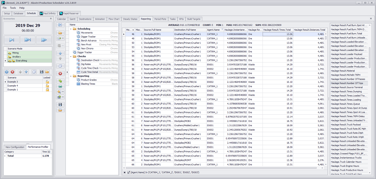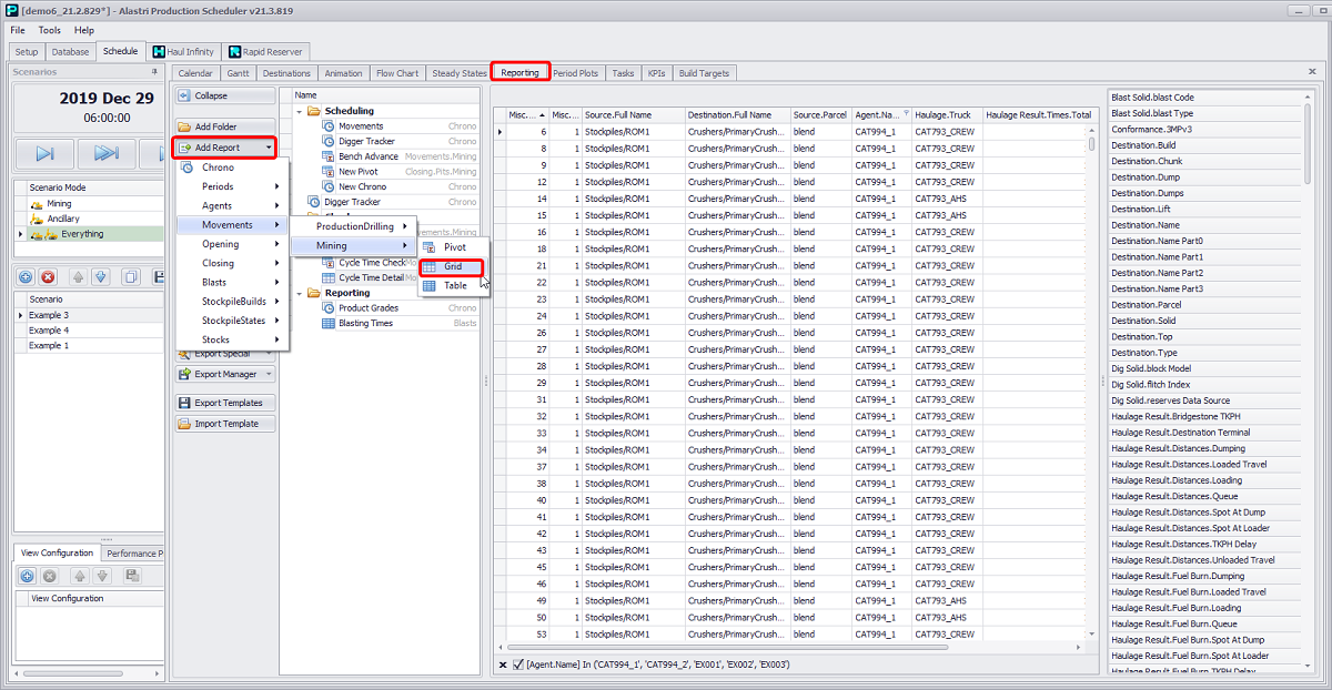 Go to Schedule tab > Reporting tab > Add Reports button > “Movements” option > “Mining” activity > “Grid” option.