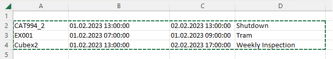 If no data has been copied to the clipboard, the error message appears: “The data copied needs to be in three or four columns: Equipment name in the first column, the start date in the second column, and end date in the third; optionally, with Delay Type in the fourth column.”