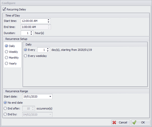 If the delay happens more than once, tick the check box and set the frequency and the time range of the recurrence: