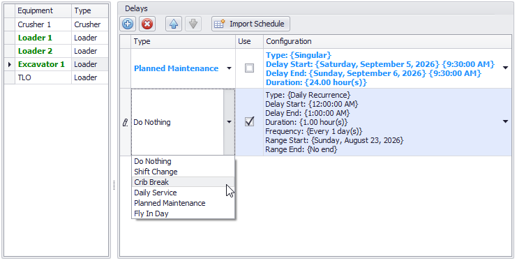 Maintenance delays, listed in the Maintenance Delays step, are delays which are applied to individual pieces of equipment.