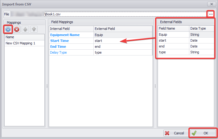 Add a New CSV mapping using the blue plus icon, if required. The UI allows for multiple mappings to be saved to support inputs from different data sources.
