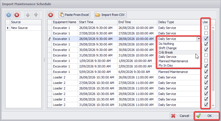 Once the delays have been imported and OK has been clicked, the delays can no longer be edited. To make adjustments in the time or type, return to the Excel Sheet or the Import Maintenance Schedule window and make the necessary corrections there.