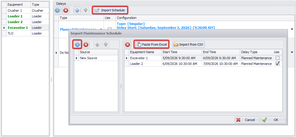 Import Schedule > Paste from Excel > Imported data will be populated for each piece of equipment specified in Excel and appear in bold blue.