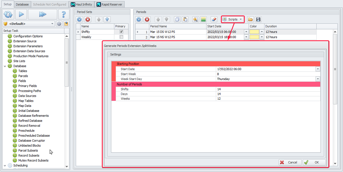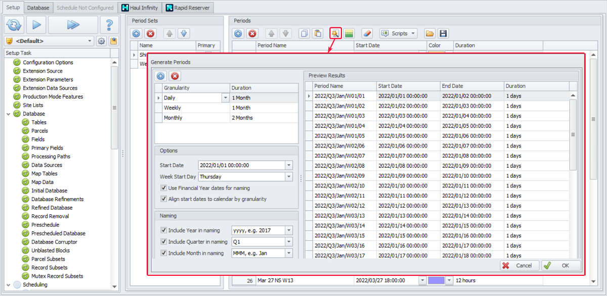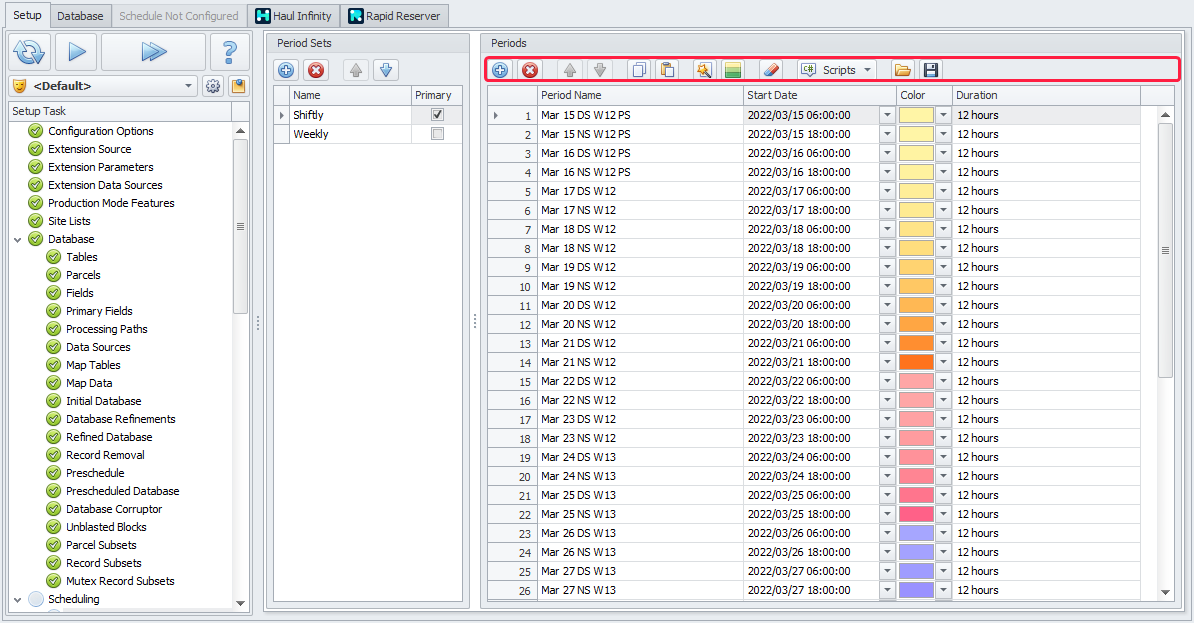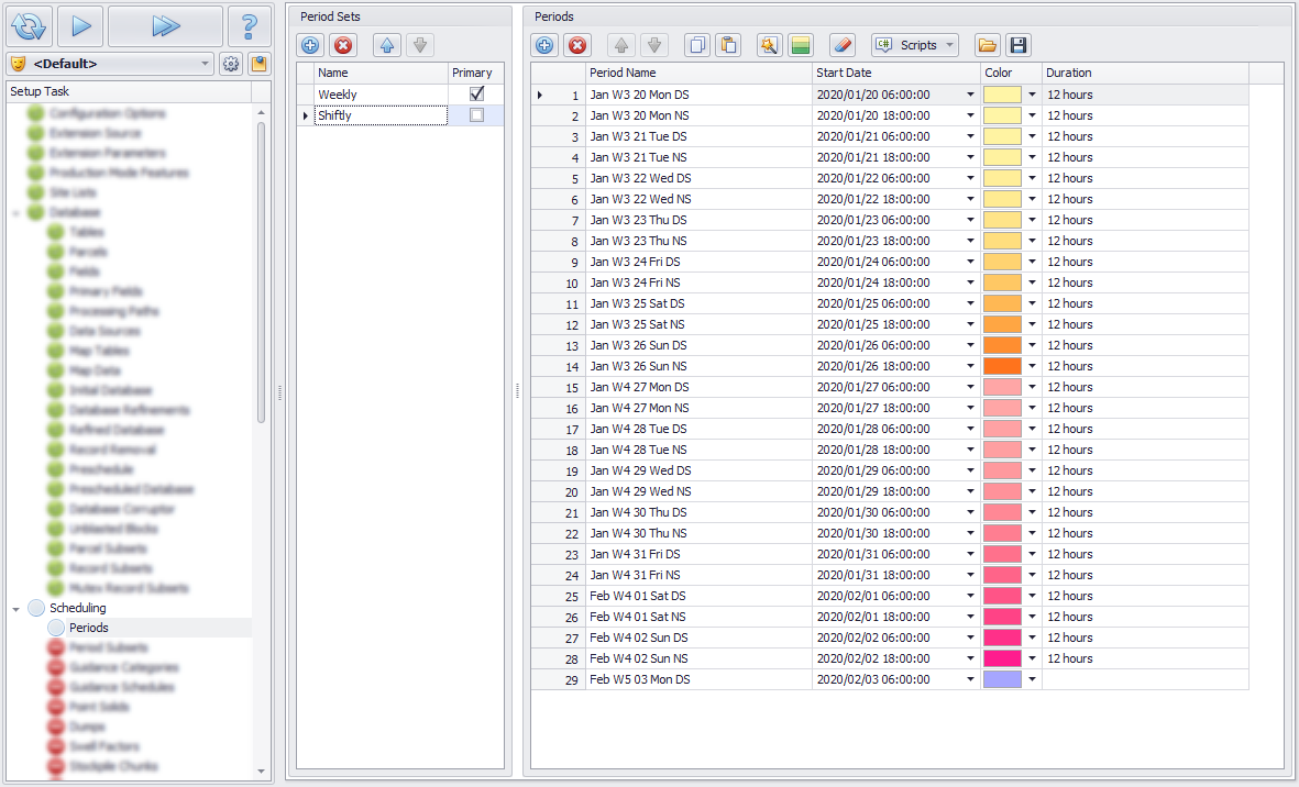 The Periods step creates a set of time intervals for fixed schedule inputs. These become columns in the Calendar to hold inputs such as crusher rates, truck availability, and grade targets.