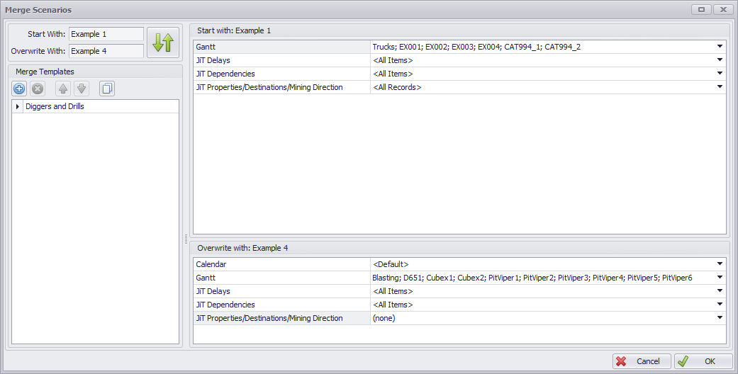 The Merge Scenarios dialog will appear. Choose which items to merge from both scenarios. Specify the required parameters for the start scenario and the overwrite.