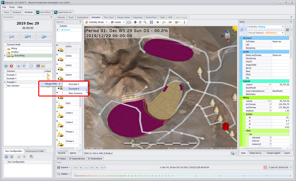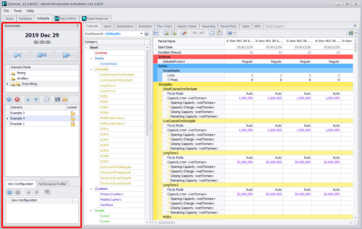 Each scenario runs a schedule based on the inputs in its Calendar, Gantt, and Animation tabs.