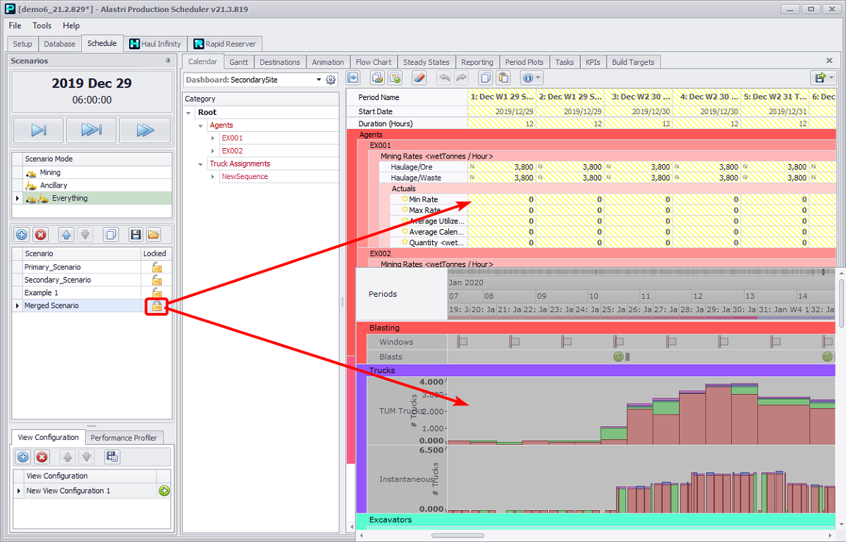Click the Locked icon to prevent the selected scenario from making changes. Locked scenarios will be hatched yellow in the Calendar tab, and grayed out in the Gantt tab. To unlock and allow changes, re-click the lock icon to "open" it.