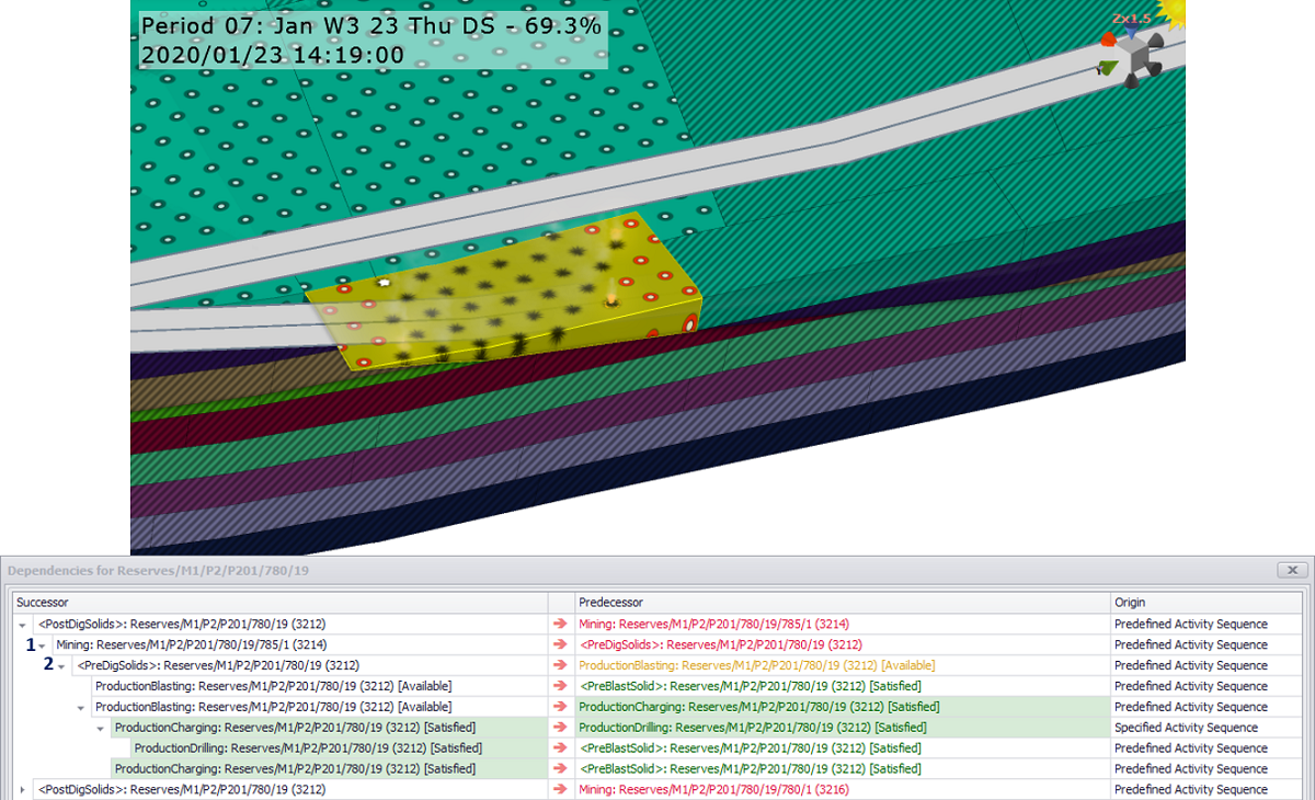 A step by step walkthrough of dependencies for a single mining solid through a drill, blast, mine life-cycle.