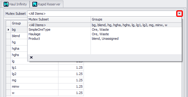 By default, swell factors are applied to the <All Items> Mutex Subset. You can change it to “SimpleOreType“, “Haulage” or “Product“ from the Mutex Subset field drop-down (Mutex Subsets available are configured in the Parcel Subsets step).
