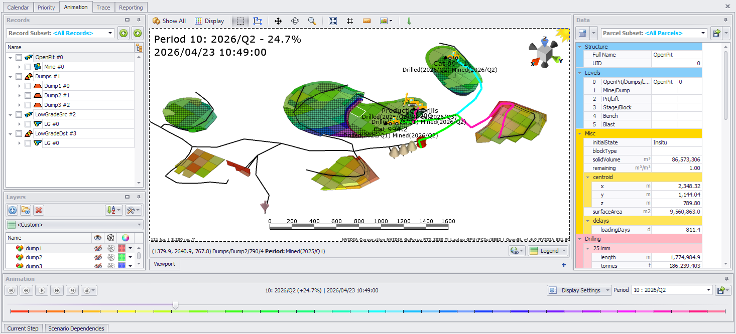 The Animation tab provides the user with a graphical representation of the activities performed by periods, as well as the ability to select data to display.