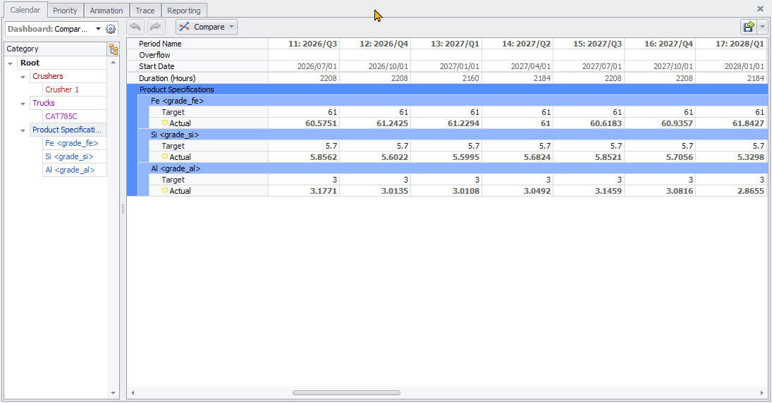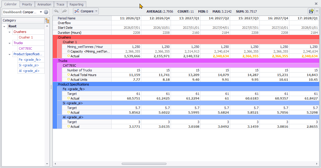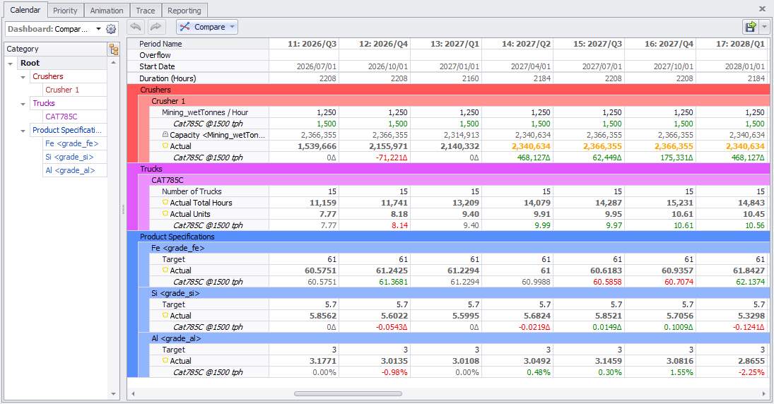 Calendar Input and Output fields can be compared when viewing a custom Dashboard. This allows users to quickly validate inputs and compare the results of multiple scenarios, without having to swap between each scenario.