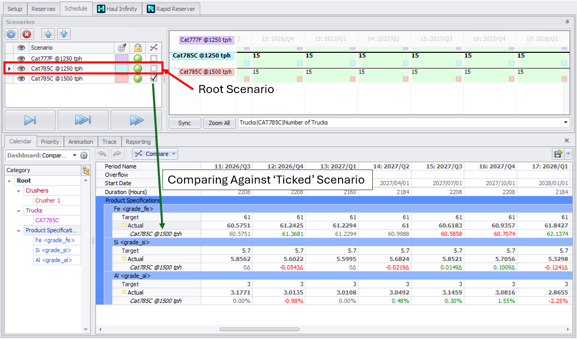 The selected scenario is considered the root scenario. Other scenarios with a tick in the compare column will be compared against in the calendar.