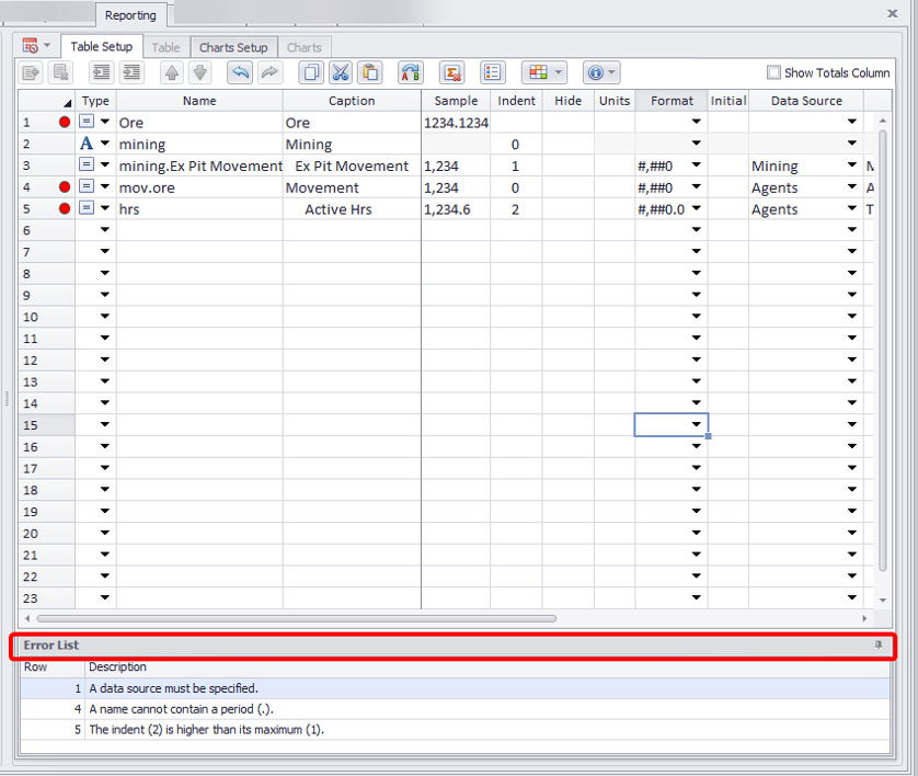 A red circle on the left of the Type column indicates that you have made some mistakes filling up a table or there are some unresolved issues. Check the Error List below to get a description and fix all the errors listed.