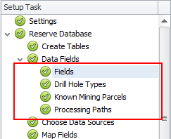 In the Setup Task > Reserve Database > Data Fields steps, data fields are created to hold values imported from the inventory files. These may include properties for each block, for the block contents, or for drilling activities.