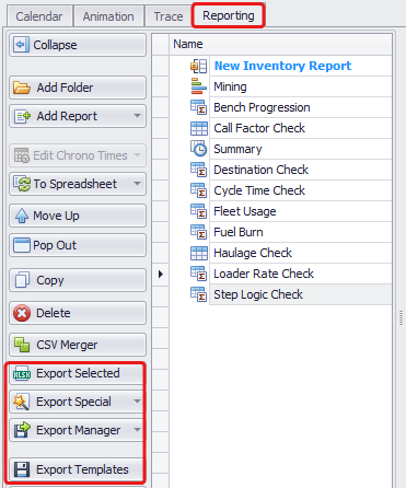 Different export options are available in different tabs and panels. Examples are shown further down this topic. Click on the following links for more information: