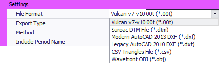 Select file export format: *.00t”, *.dtm, *.dxf, *.csv, *.obj |