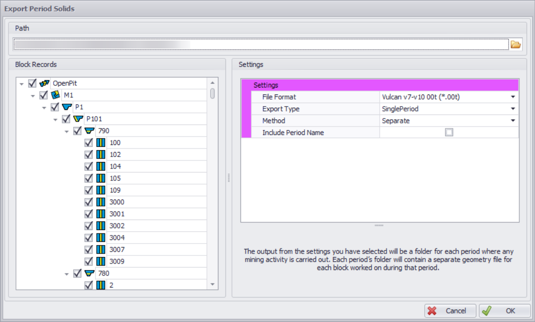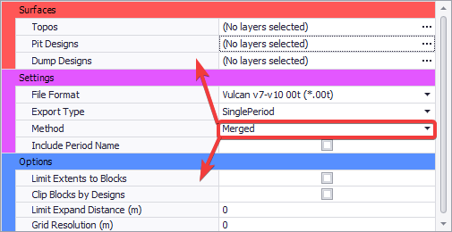 The output from the settings you have selected will be a separate geometry file for each period where any mining activity is carried out. Data will be split into two files, one for Dumps and one for Pits, containing data for any block worked on during that period. Selecting “Merged” displays additional fields to fill in:
