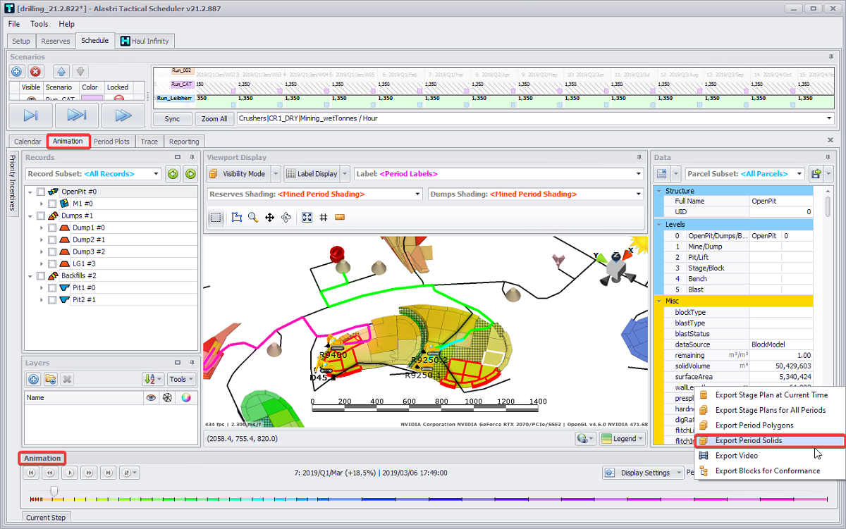 Period Solids (also: mined volumes, cut volumes) are 3D triangulations representing the volume(s) mined in one period of scheduling.