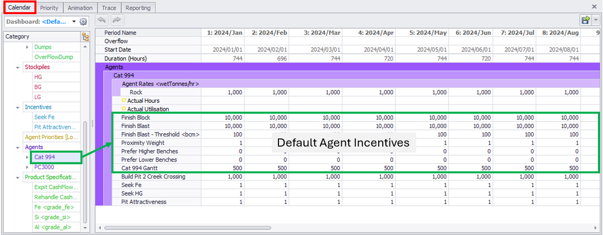 Incentives rows in the Calendar and Calendar weightings of Incentives by Agent