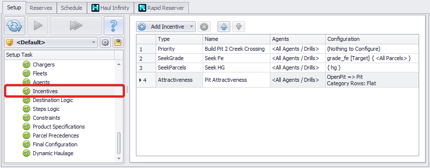 Attractiveness incentives are listed under Schedule > Calendar > Incentives and cause certain locations to be ranked higher by the Agent.