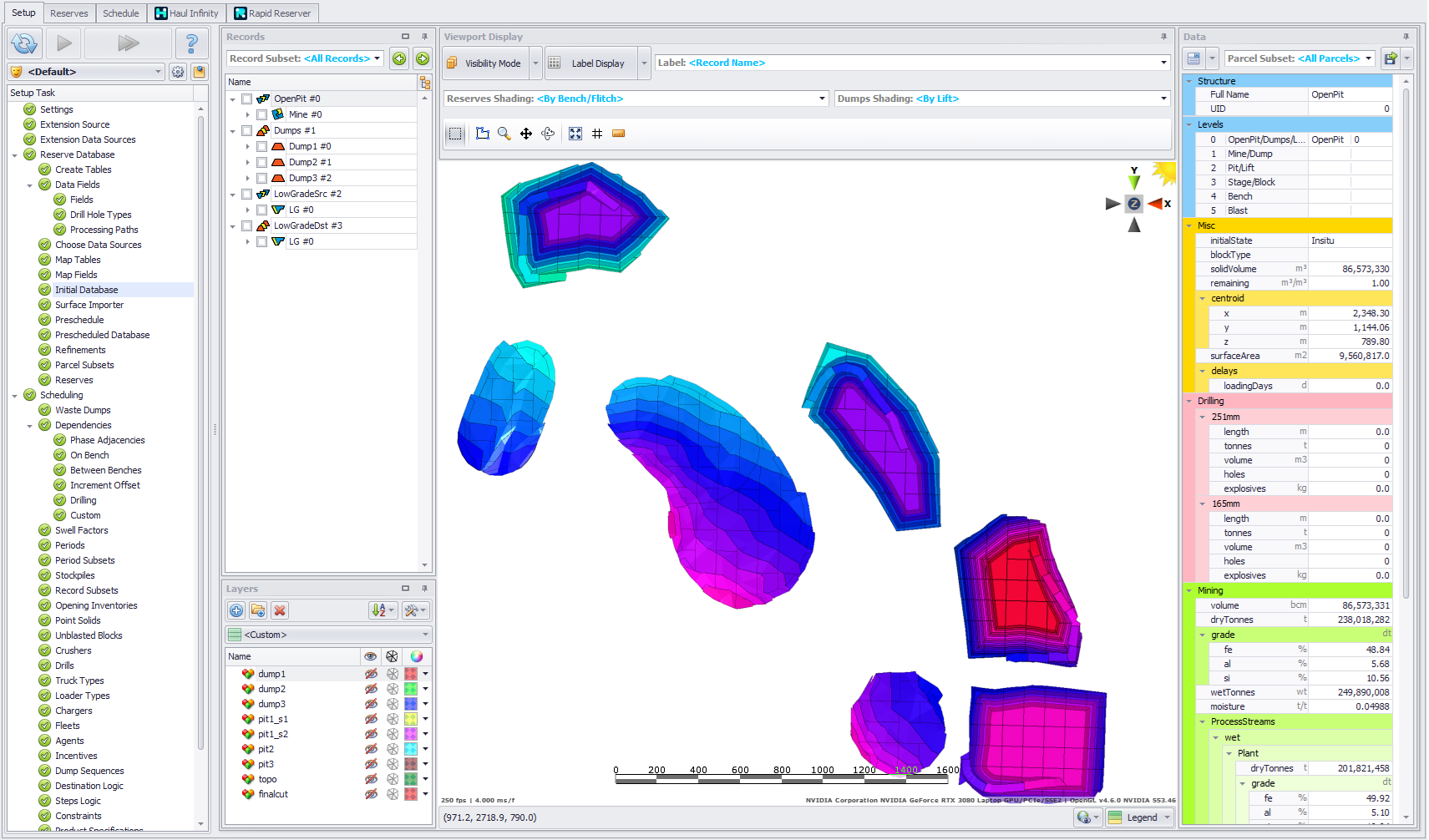 The Initial Database step represents the Reserves database, initially imported to the project. In this step you can view all the levels of Reserves and Dumps solids, adjust their color coding and labels, review different solids properties, as well as filter them by Activity and Parcel Subsets.