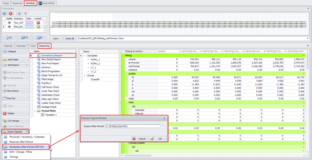 Press Export Special button and select “Stockpiles After Period (SPCSV)” option.