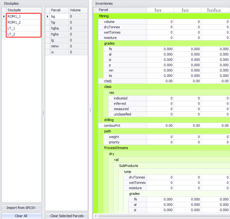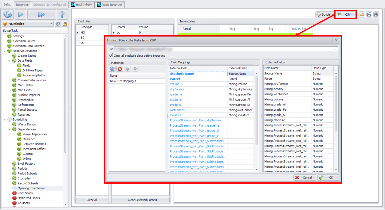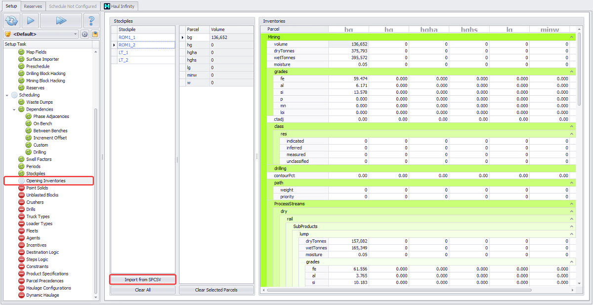 In the Opening Inventories step, click Import from SPCSV to populate stockpiles inventories with your site stockpile current state data: