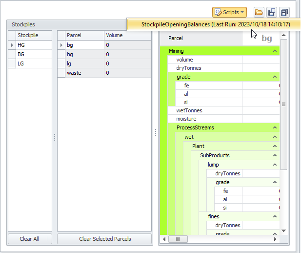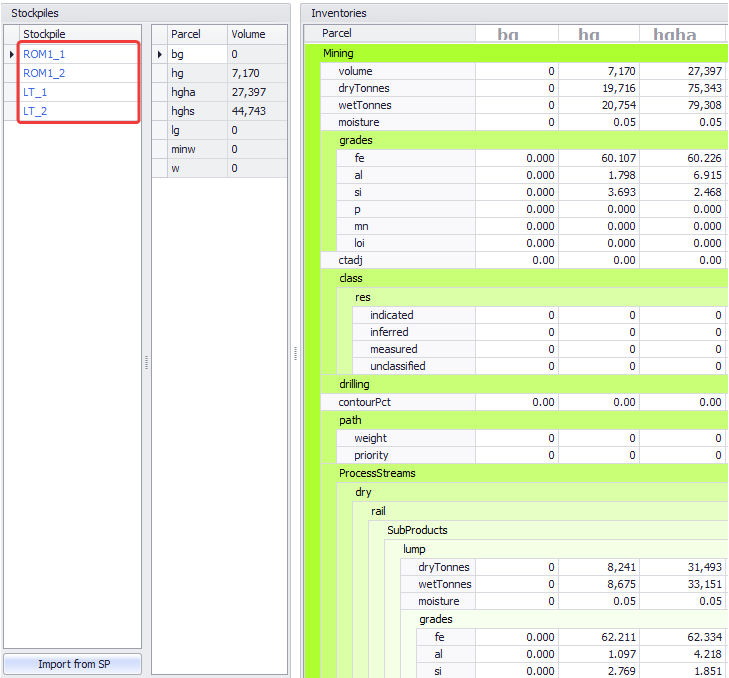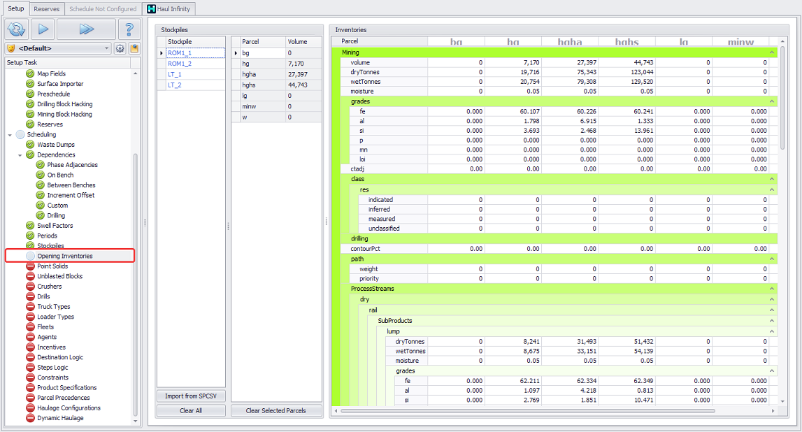 Use the Opening Inventories step to set starting stockpile volumes, tonnes and grades.