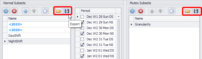 Normal Subsets and Mutex Subsets can be exported/imported from projects using the folder and floppy disk buttons located in the toolbars.