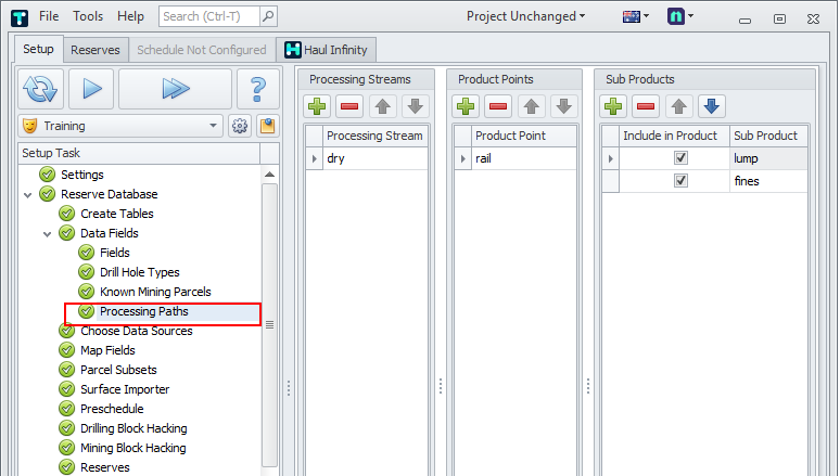 The Setup Task > Reserve Database > Data Fields > Processing Paths step is used to allow product fields to have different values depending on how they are processed, transported and screened.