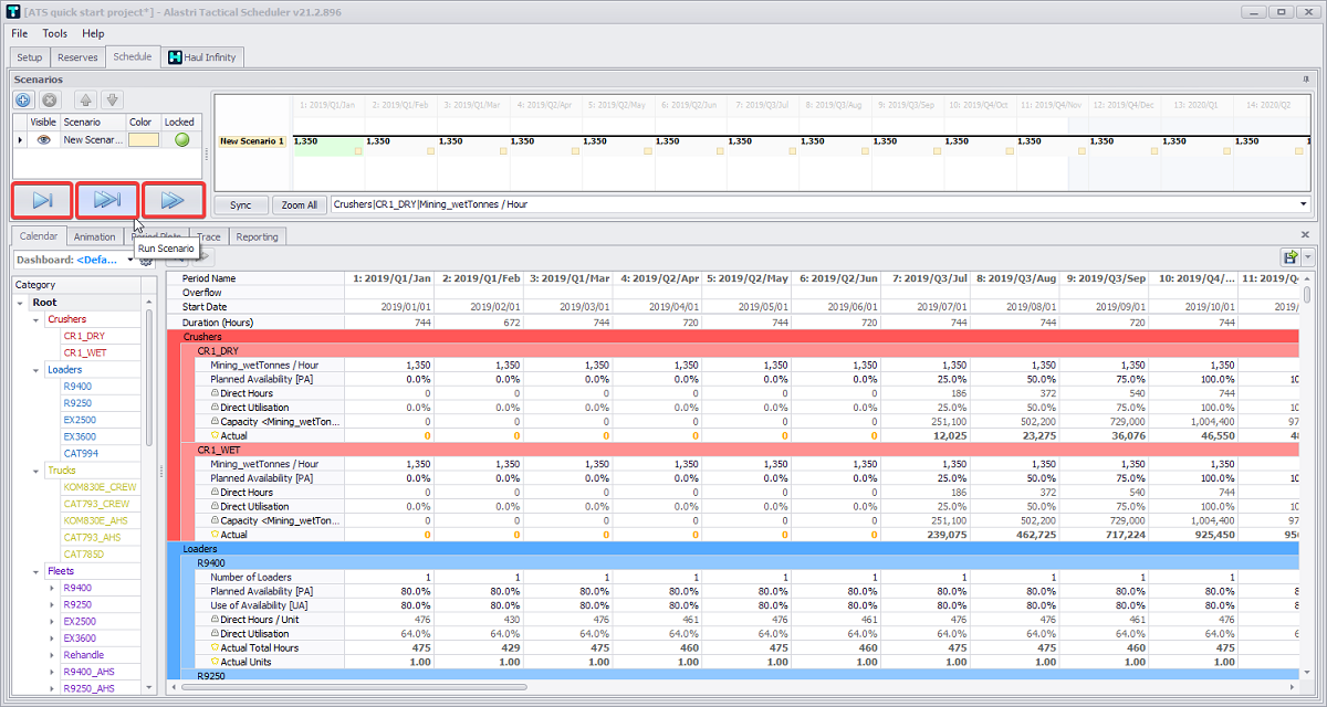 Before starting any scheduling and in order to view animation and populate any reports you should run period/scenarios/full schedule.