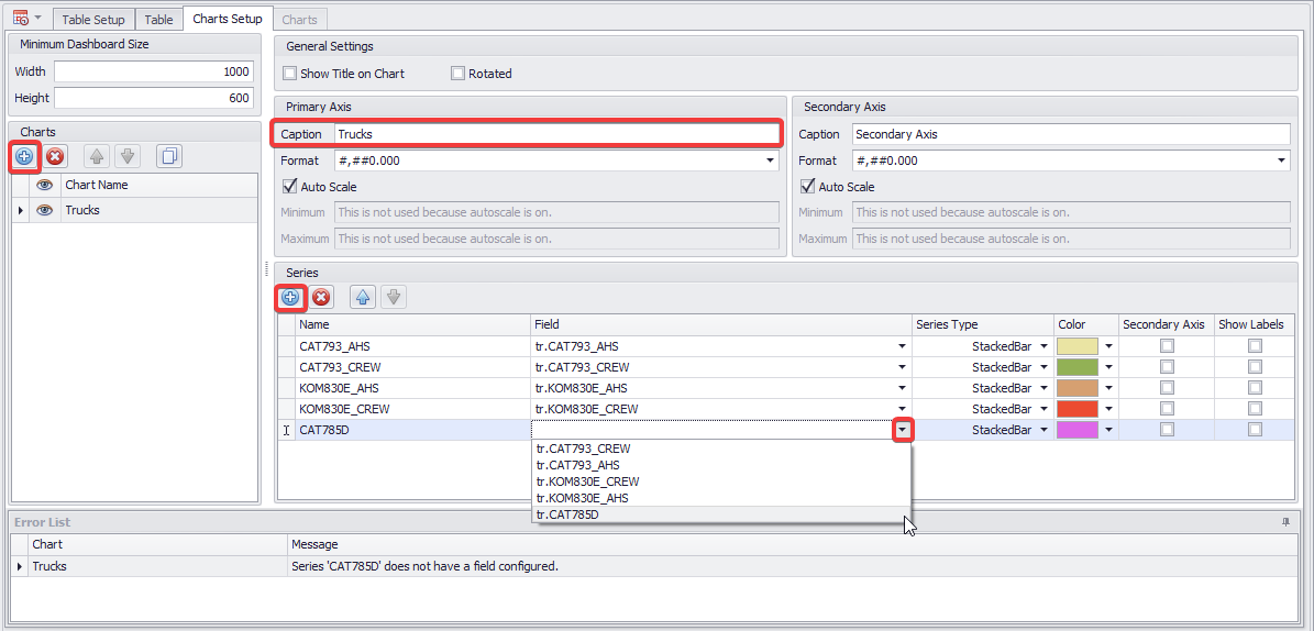 In the Charts panel press the blue plus button to add a new chart. Name it “Trucks”.