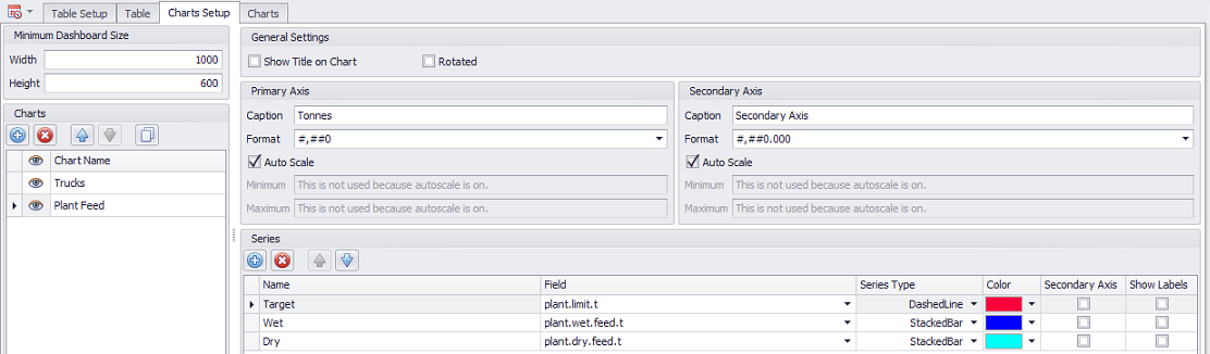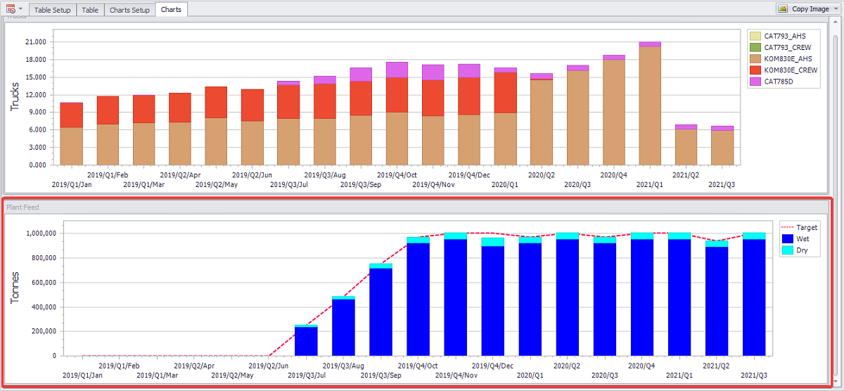 Create a Chart to display Plant Feed tonnes, based on wet and dry tonnes feed and target limit.