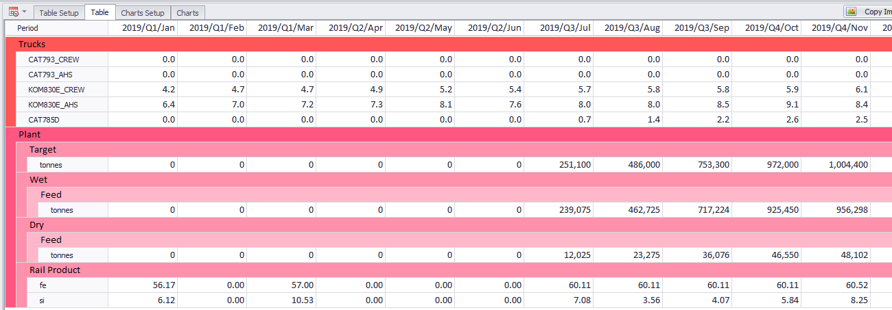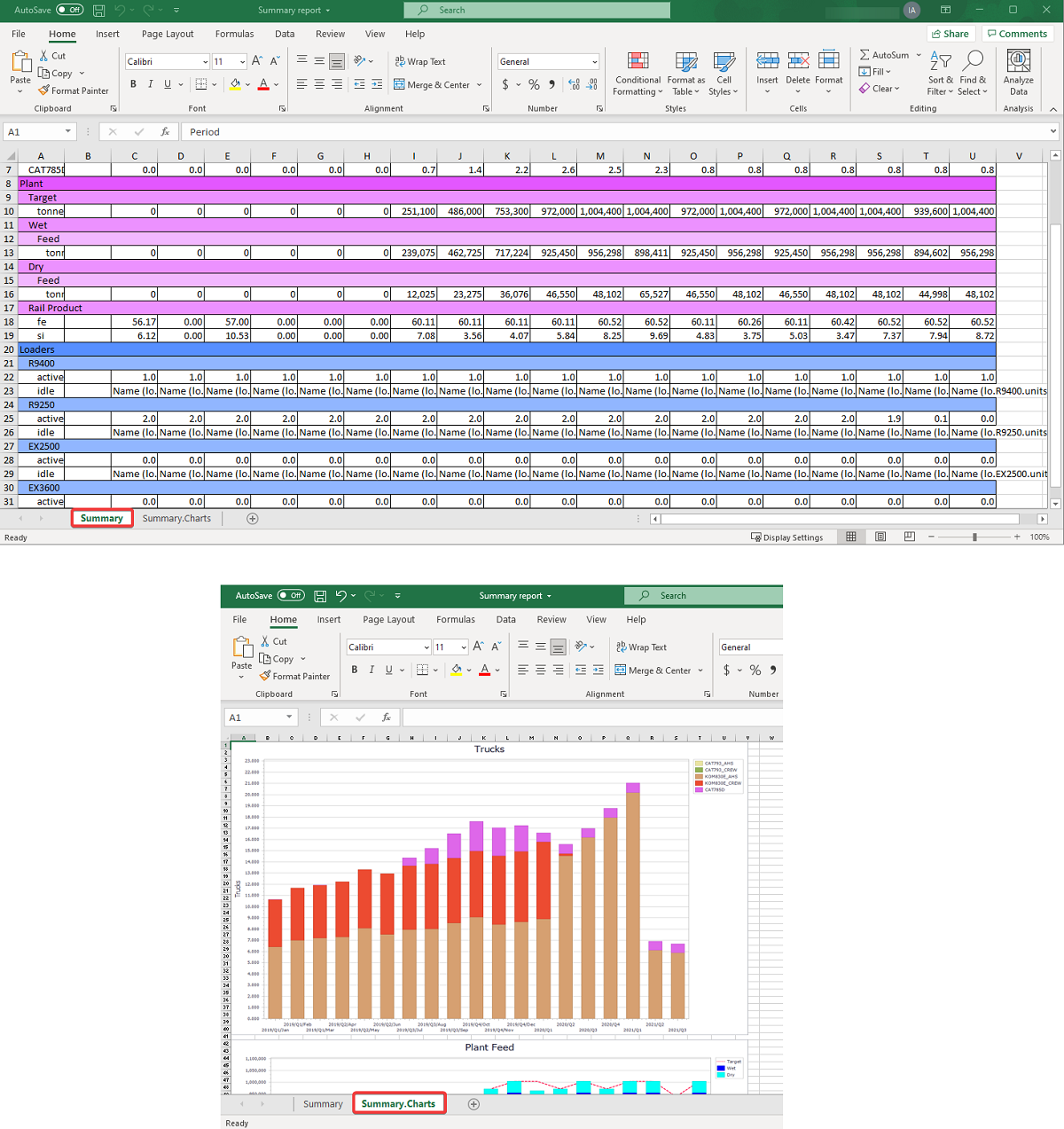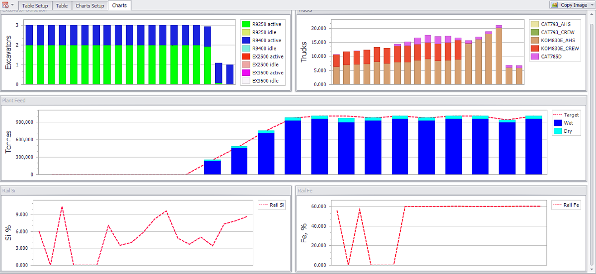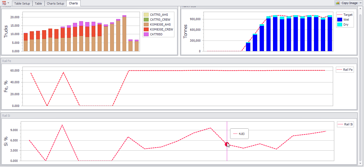 You can move blocks of charts in the Charts tab as desired, by dragging and dropping them. For example, you can place Excavators and Trucks Utilization, or Si and Fe percentage charts next to each other to visually compare them.