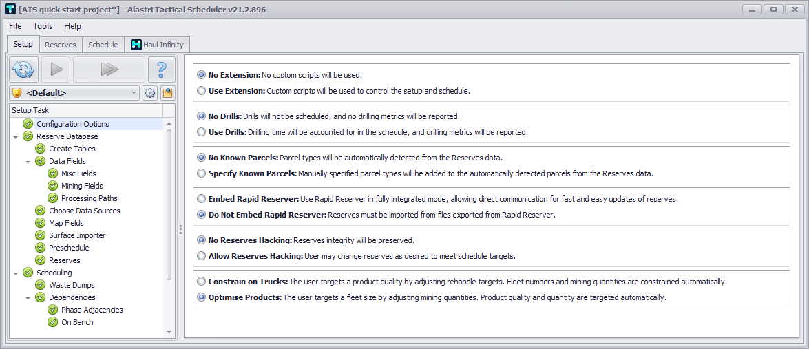 For this demo project, flag No Extensions, No Drills, No Known Parcels, Do Not Embed Rapid Reserver, No Reserves Hacking and Optimise Product options.