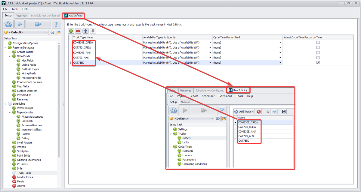 Truck definitions must be present in Haul Infinity in order for the scheduler to reference them. Instructions on how to add Trucks Types in Haul Infinity see Truck Models.