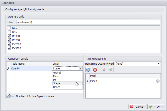 Agent Assignments: creates a table of loader assignment limits for each pit, stage or bench. (This option requires Use as Agent option ticked for required loaders).