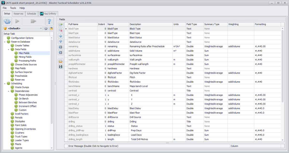 | Indent | Name | Description | Units | Field Type | Summary Type | Weighting | Formatting |