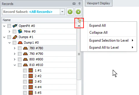 Expand selection or all records to a certain level, such as Reserves/Dumps - Mine/Dump - Pit/Lift - Stage - Bench.