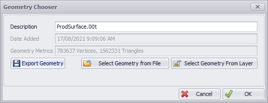 Users can import the surface from a file or the Layers panel by clicking the drop-down in the selected Surface Triangulation cell. Geometry Chooser dialog window will open.