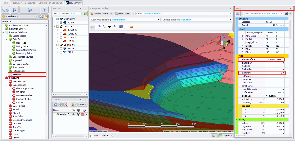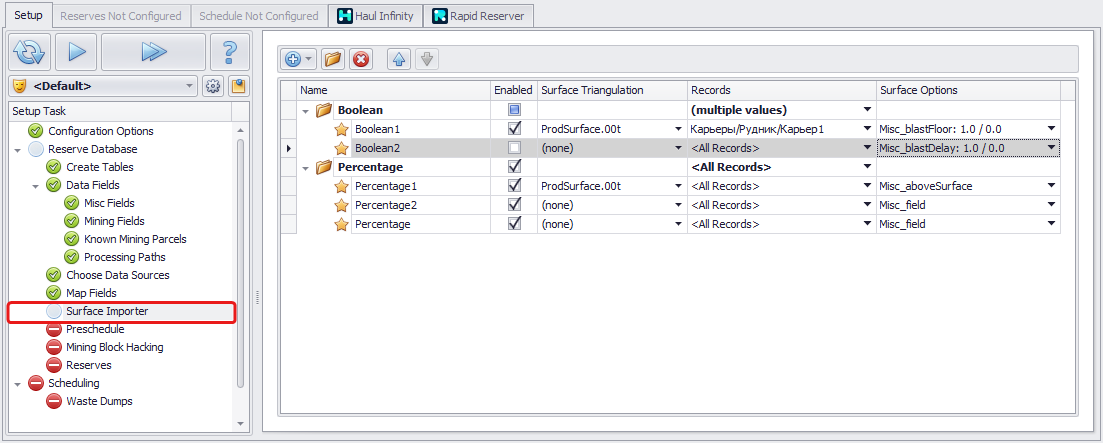 The results of the Surface Importer step can be seen in all of the viewports containing the Data panel (i.e. Reserves and Preschedule Setup Task, main Reserves tab, Animation tab). The results will be stored in the applicable database fields located in the Data panel. An example of this can be seen in the image below; both the Boolean and Percentage types of results are shown.