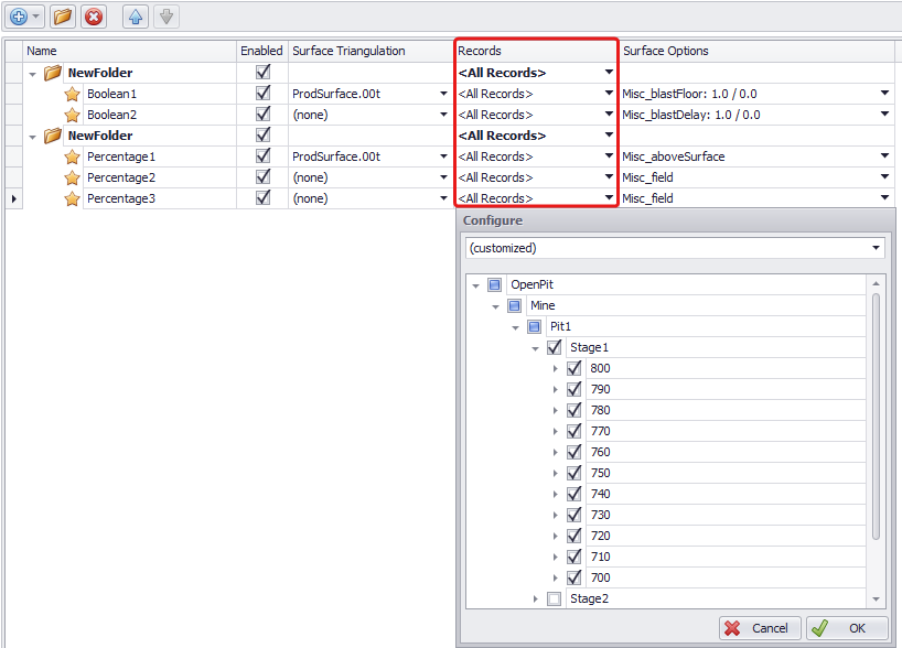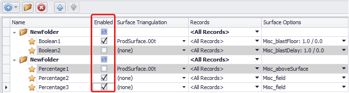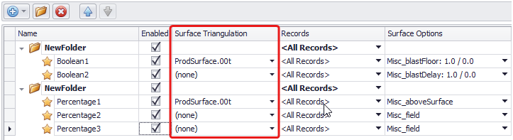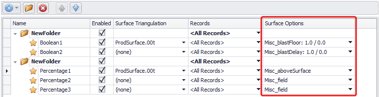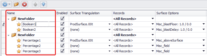 The Surface Importer step is used to flag dig and blast solids based on their position relative to the surface (above or below). Thisstep encompasses a table-like structure, where table items can be listed individually, or be grouped within folders. The main items of this tab are outlined below.