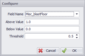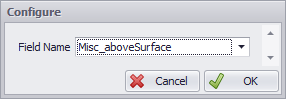 In the Configure window > Field Name section, select the applicable database field. The fields in the Field Name list can be customized in the Data Fields > Misc Fields step. Return to this Setup task step if you need to add other fields to be displayed in the list (more details, see Data Fields). In the Configure window, the applicable database field can be selected. Please note that for the Boolean flagging, three additional fields are available. The values for whether the solid sits above or below can be defined in the Above and Below Values fields. The Threshold field is used to solve the cases when a solid sit both above and below the surface. |