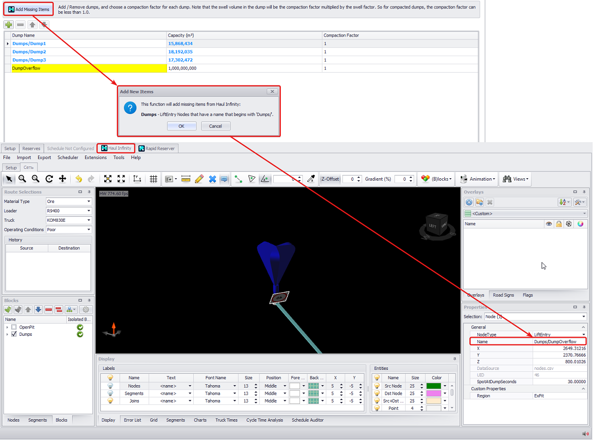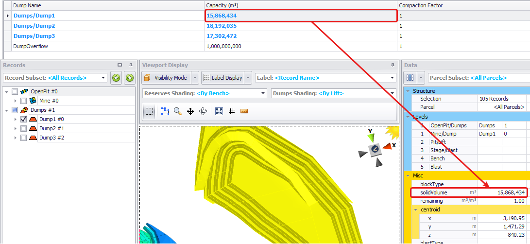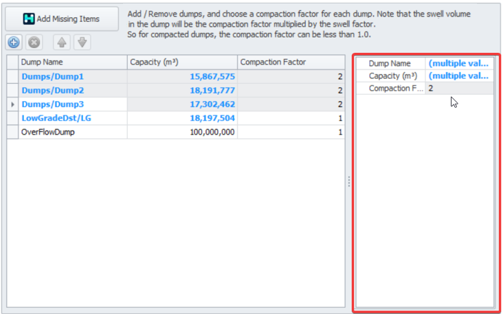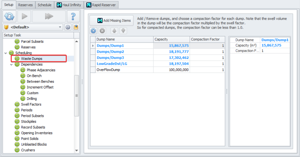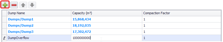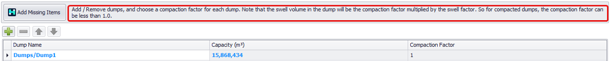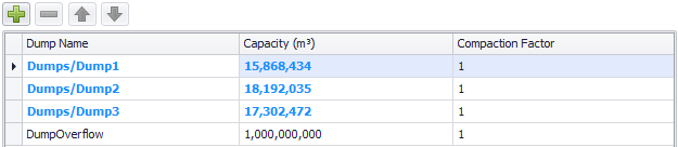 The capacity of dumps added from the database is filled in automatically and based on the dump solid volume. It should be the same as the solid volume specified in the Reserves tab/setup step. The capacity of the dumps added as dump points must be specified manually, allowing for a larger capacity. |