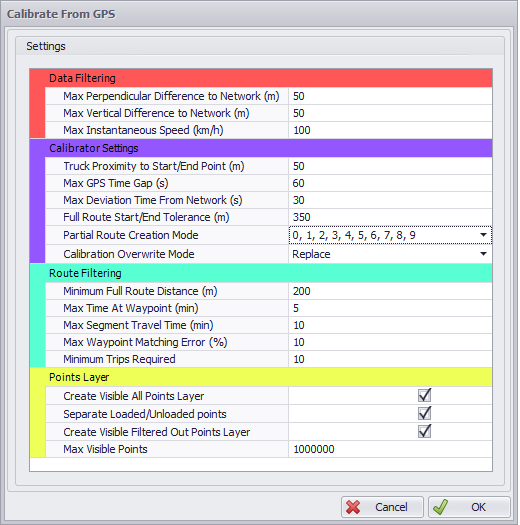 Lower values can reduce calibrations that include unusual truck activity where it has stopped at a waypoint but GPS points are still being created.