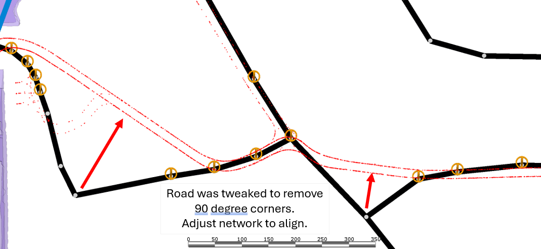 Using the layer created during the import process, visually inspect the network for areas where the road segments do not match the layer. These discrepancies could be caused be several different factors so it’s important to validate if this is a temporary or permanent change. Adjust the HI network accordingly, delete the imported calibration and rerun the import process to update the adjusted roads.