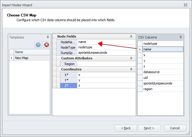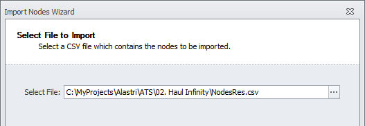 Nodes (of Stockpiles, Crushers, Waypoints, BenchExits, LiftEntries, Chargers and Substations) can be imported from a CSV file.